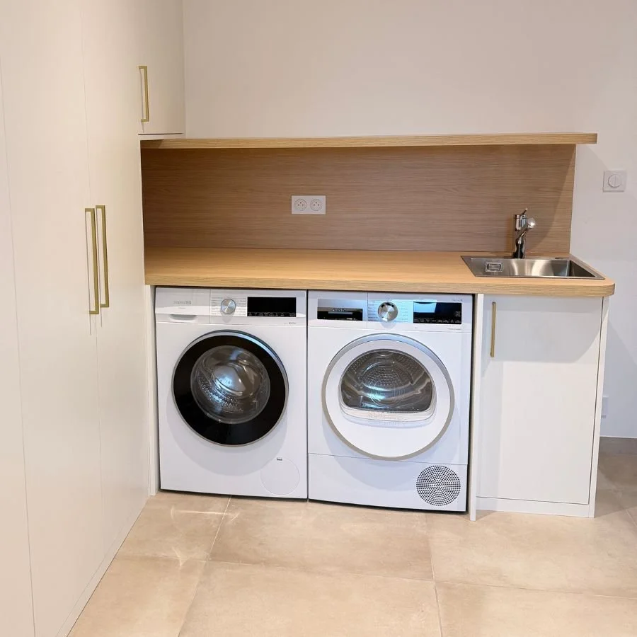 Placards, plan de travail ou rangements pour machines permettent d’organiser efficacement l’espace. Une buanderie bien pensée simplifie le quotidien.
